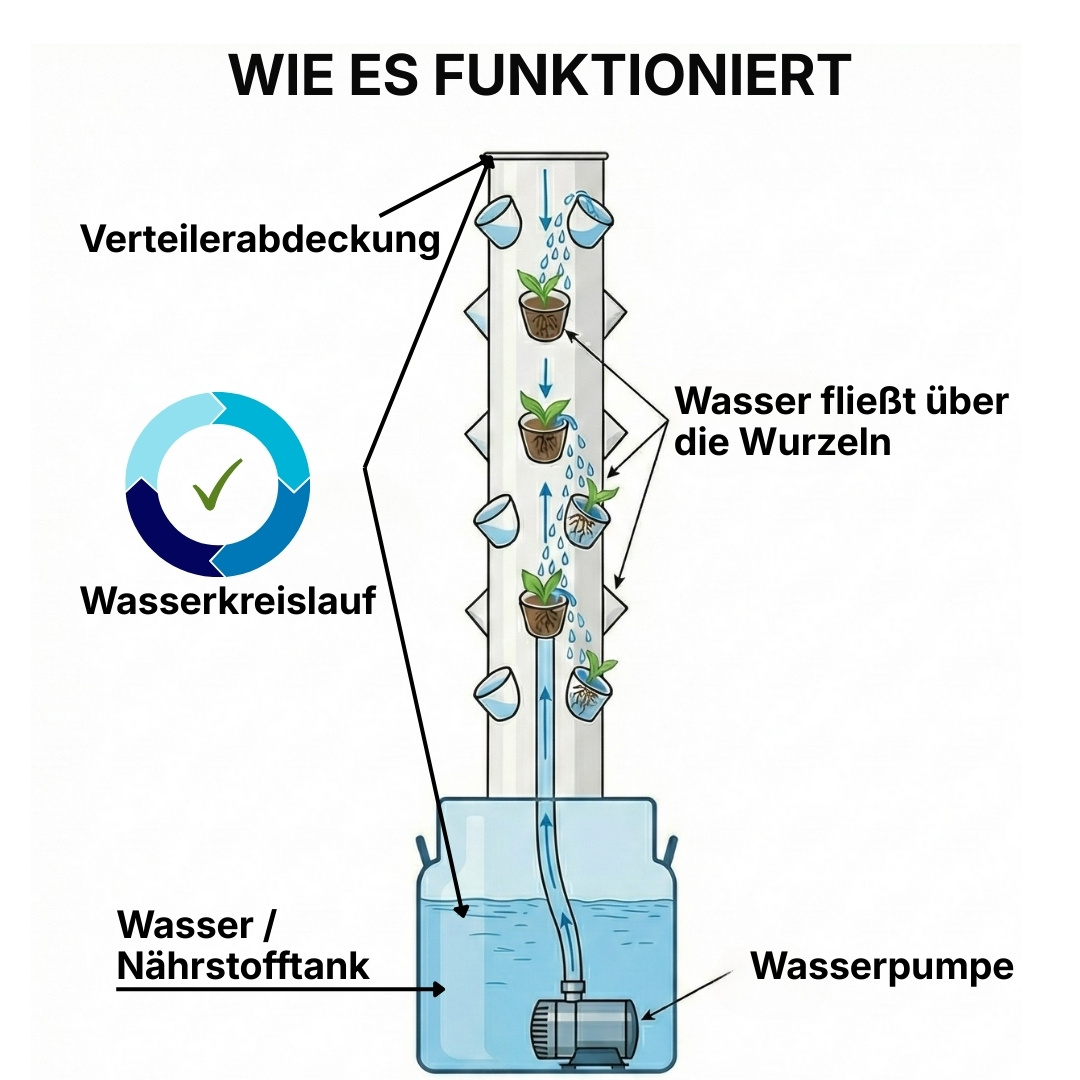 Mein größter Vorteil gegenüber anderen Türmen: Jede Etage hat ein integriertes Reservoir. Fällt der Strom aus, stehen die Wurzeln weiter im Wasser (ähnlich Kratky). Das rettet deine Ernte im Notfall.